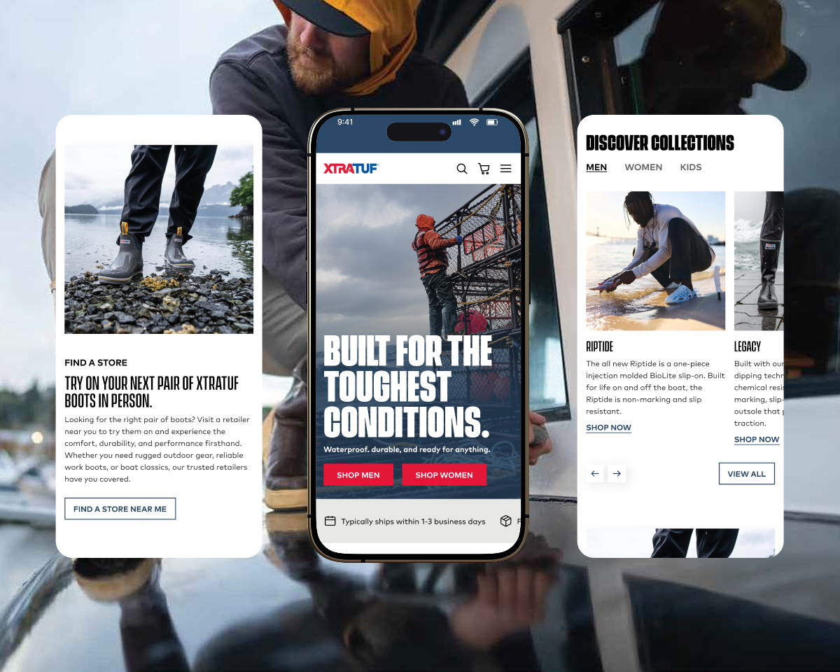 My role focused on creating a shared design language and scalable system that could be adapted across nine brands. To ground the design decisions, I conducted user research that included a competitive analysis, brand personas, and customer service interviews. These insights highlighted gaps in the current experience and helped shape priorities around navigation, product discovery, and brand storytelling. Building on this foundation, I designed modular components that balanced consistency with customization, enabling each brand to highlight its unique voice while maintaining usability standards. Navigation structures were reimagined to guide customers intuitively, and product detail pages were designed to combine storytelling with upsells and cross-brand opportunities. I also optimized layouts for performance across mobile and desktop, ensuring every interaction felt seamless. The result was a design system and platform that not only elevated the customer experience but also empowered Rocky Brands to deliver high-performing storefronts at scale with flexibility for future growth.